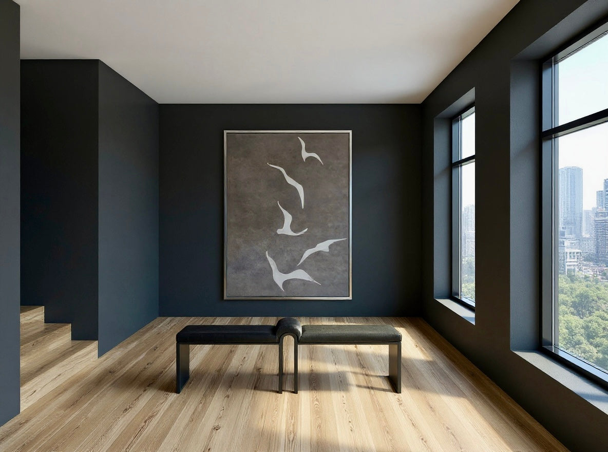 This abstract artwork presents a striking interplay between the ethereal forms of birds in flight and a moody gray sky. The graceful silhouettes of the birds evoke a sense of freedom and movement, contrasting beautifully against the textured backdrop. The subtle variations in tone create depth, inviting contemplation and reflection.